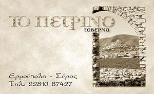 Το Πέτρινο ιδρύθηκε από την οικογένεια Μανδηλαρά το 1999 με αγάπη για την ελληνική κουζίνα και από τότε παραμένει μια από τις δημοφιλέστερες ταβέρνες της Σύρου.Η ταβέρνα μας λειτουργεί όλο το χρόνο από το μεσημέρι μέχρι το βράδυ, προσφέροντας ζεστή ατμόσφαιρα κάτω από τις πέτρινες καμάρες του το χειμώνα και δροσιά κάτω από τις πανέμορφες βουκαμβίλιες το καλοκαίρι.Στεγάζεται σε ένα παραδοσιακό κτίριο, το πρώτο κτίριο της Ερμούπολης, στο διάσημο "σοκάκι με τις βουκαμβίλιες", το πιο γραφικό σημείο της πόλης.Ελληνική παραδοσιακή κουζίναΤης ώραςΟρεκτικάΣαλάτες.